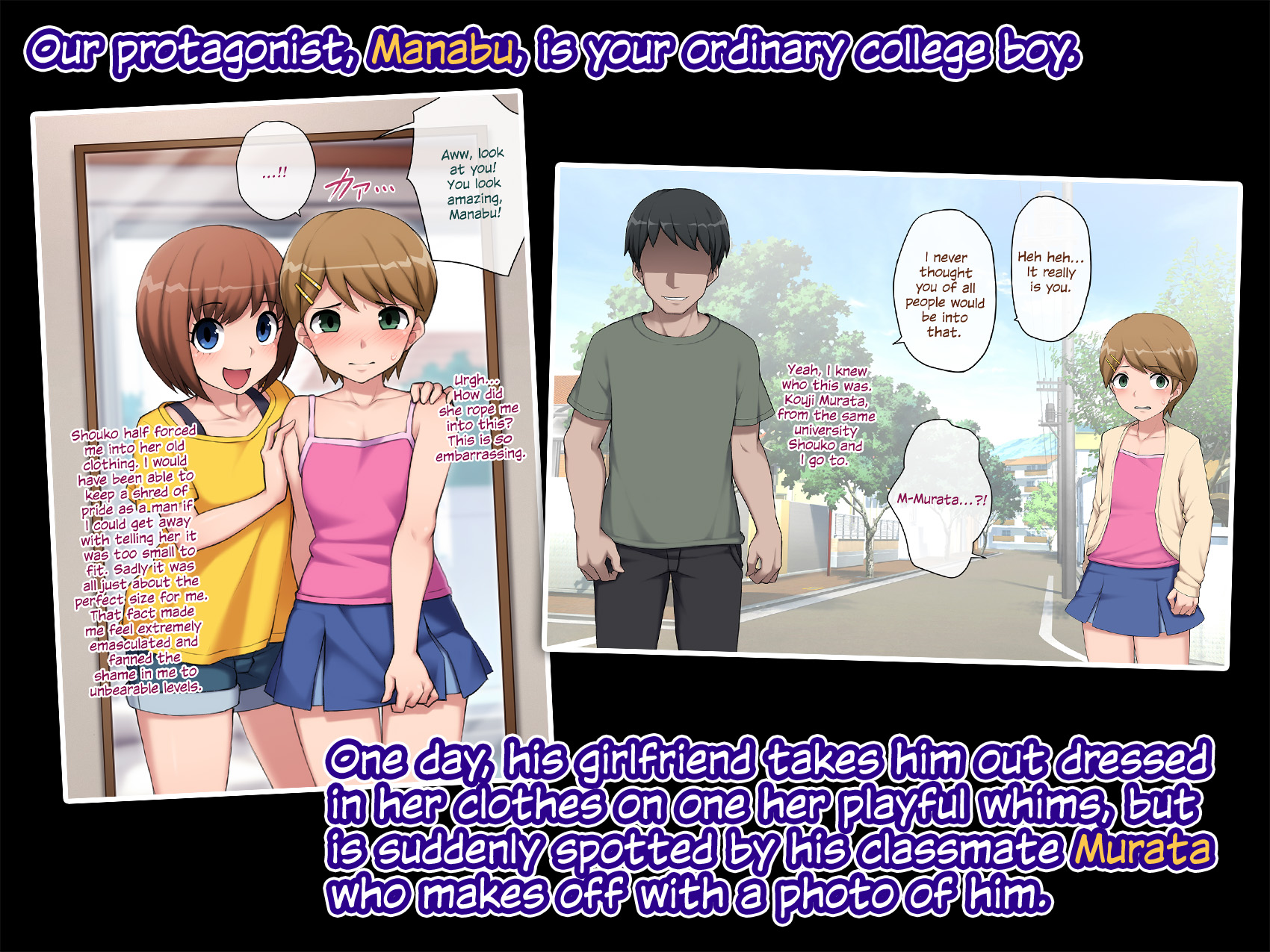 One day Shouko dresses Manabu up as a girl on one of her playful whims and takes him for a walk outside, where he is spotted and promptly photographed by his classmate Murata.