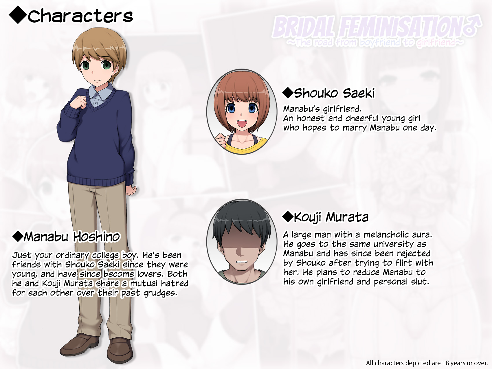 ◆ The feminisation story of a wholesome young college boy named Manabu and his fall from grace to the cock-crazed whore, Mana.